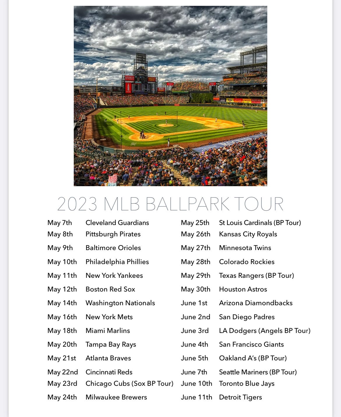 MLB Ballpark Tour Schedule!Five Weeks, 15,000 Miles, 30 MLB Ballparks⚾️Mitch McVickerMay 05, 20231ShareIf you would like to join us for a game contact my cell 419-704-9802!Thanks for reading Mitch’s Substack! Subscribe for free to receive new posts and support my work.Subscribe